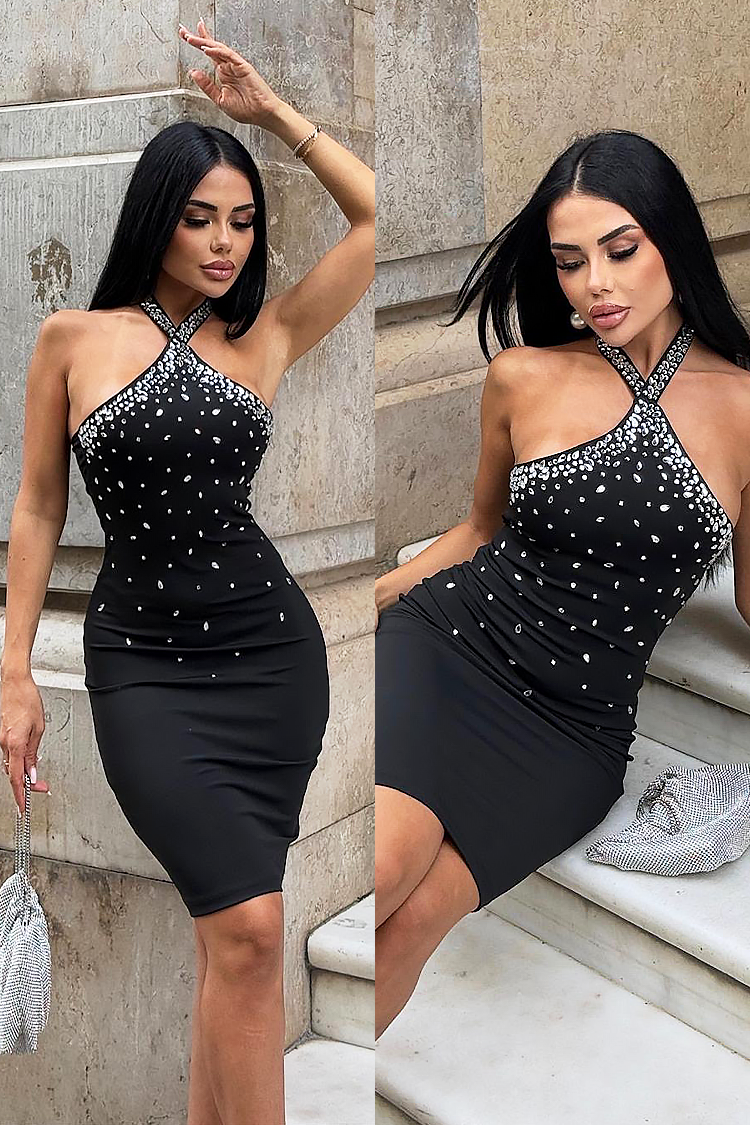- Model ma krótki krój, dopasowany, seksowny krój, atrakcyjny dekolt i błyszczące kamienie.