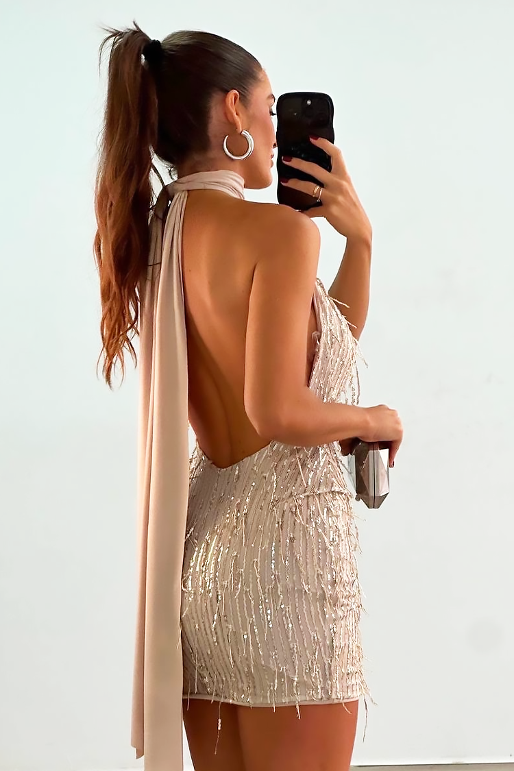 - Model ma krótki krój, dopasowany, seksowny krój, odkryte plecy i wysoki kołnierzyk z wiązaniem z tyłu.