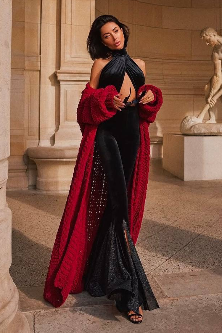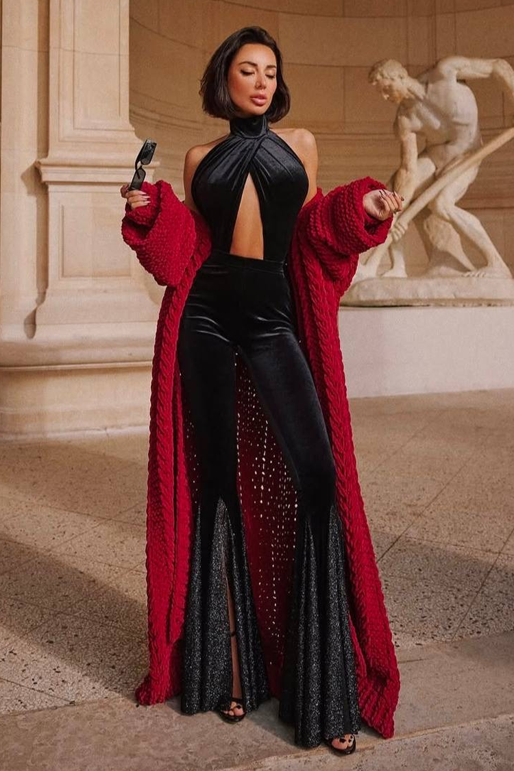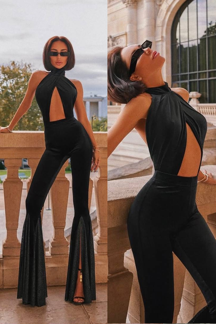 - Kombinezon ma dopasowany krój, rozszerzane nogawki, seksowny dekolt i odkryte plecy.