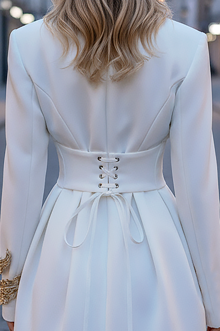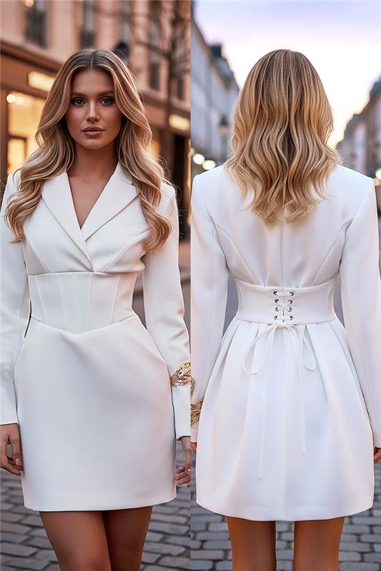 - Sukienka ma elegancki, żakietowy krój ze stylowym kołnierzykiem. Jest dopasowana w talii i wiązana z tyłu, co podkreśla kobiecą sylwetkę.