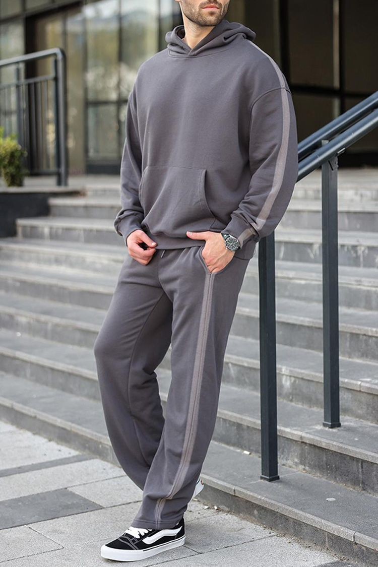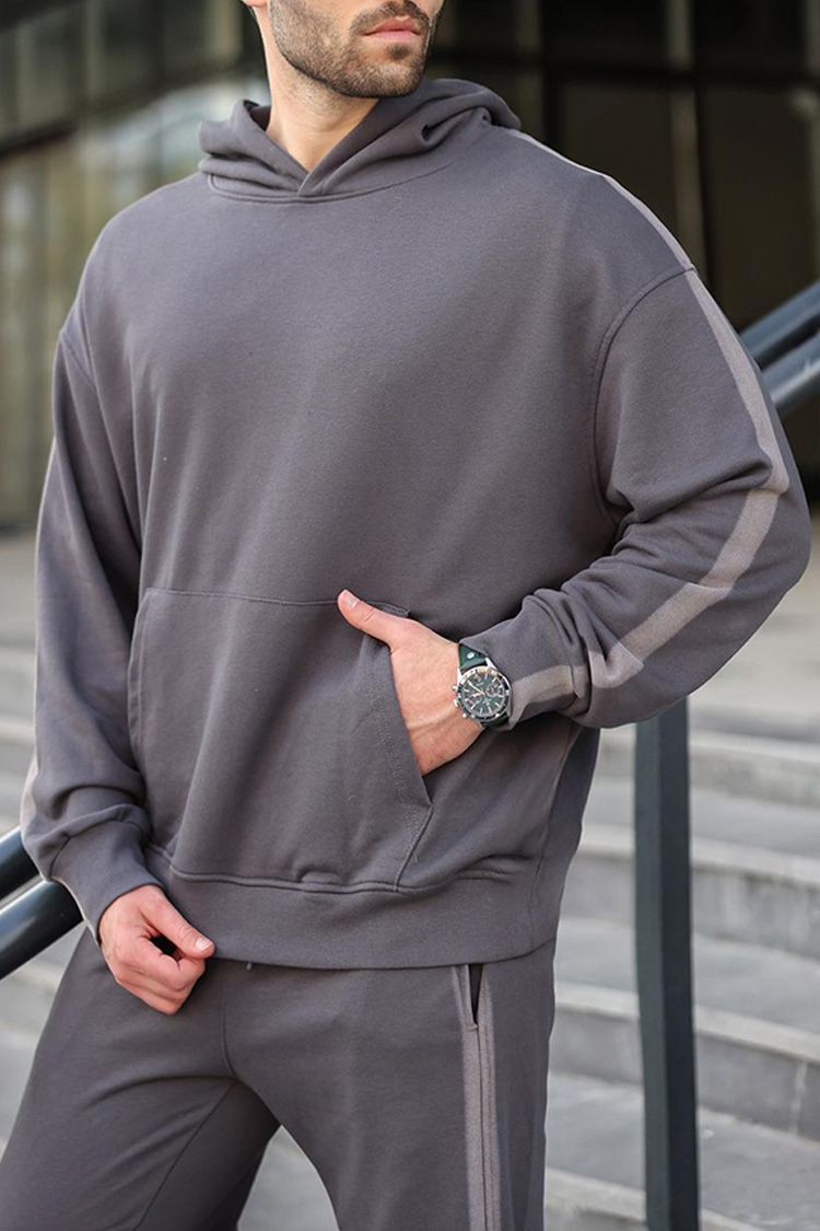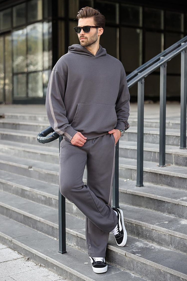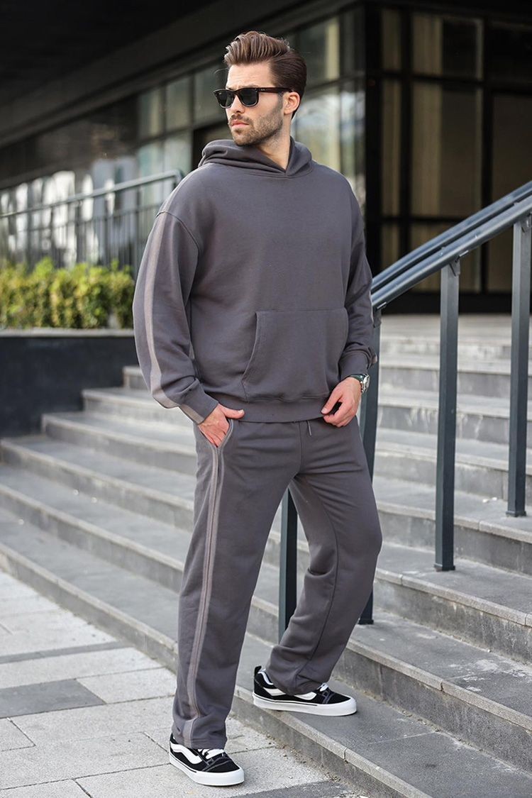 - Wygodny męski komplet w kolorze czarnym, składający się z dwuczęściowej bluzy z kapturem i spodni.