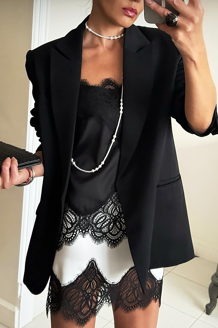 - Spódnica jest krótka, ma dwukolorowy wzór i koronkę, a góra ma cienkie ramiączka i seksowny dekolt.