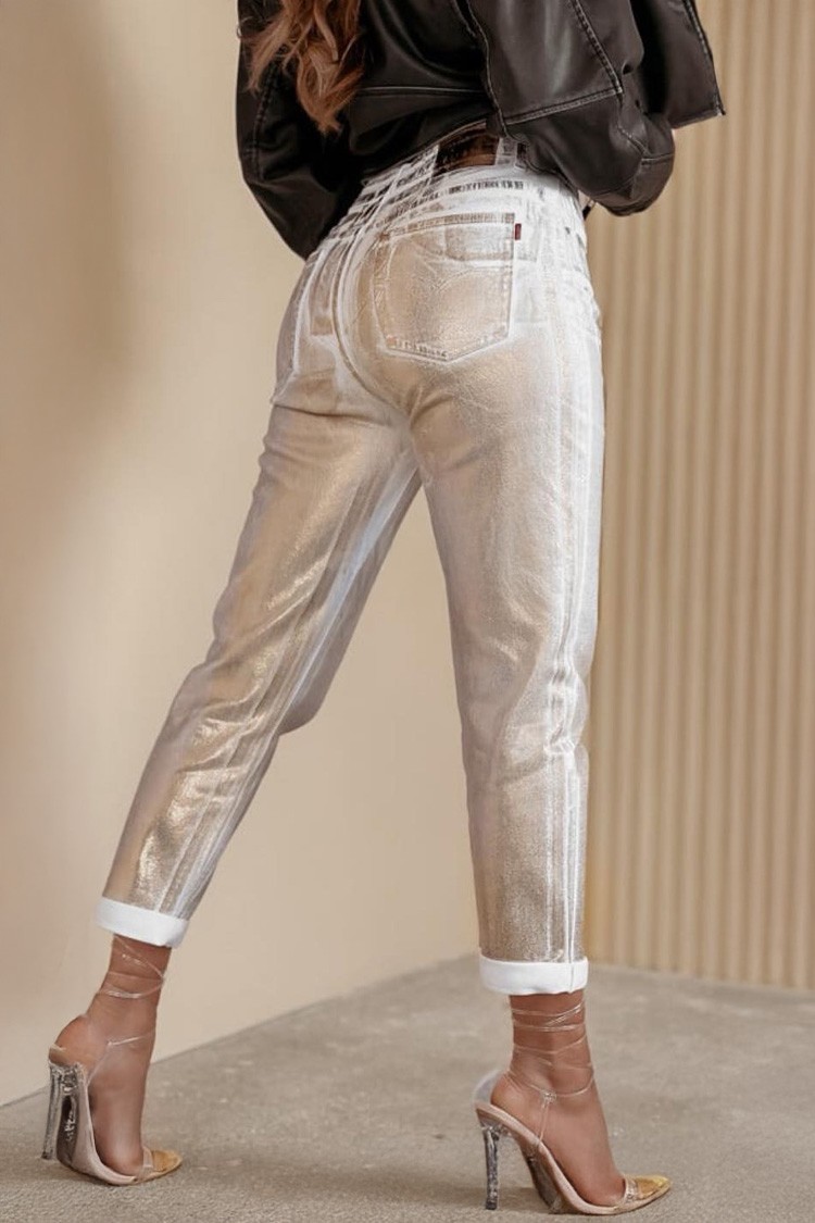 - Model ma wysoki stan, szerokie nogawki z obszyciem i spektakularny połysk.