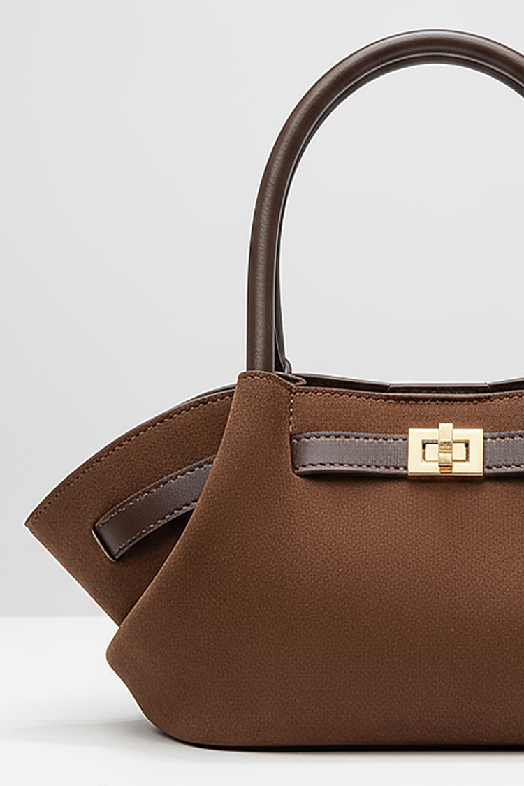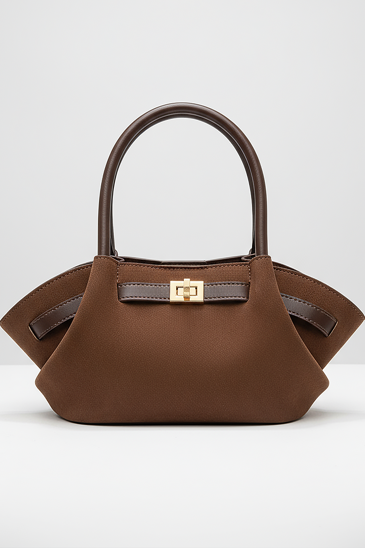 - Model posiada krótkie uchwyty z eko-skóry i efektowny pasek z klamrą.