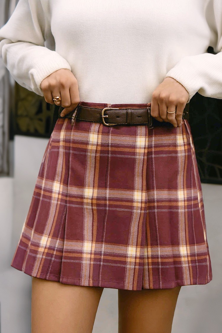 - Model ma wysoki stan, wzór w kratkę i pasek z ekoskóry.