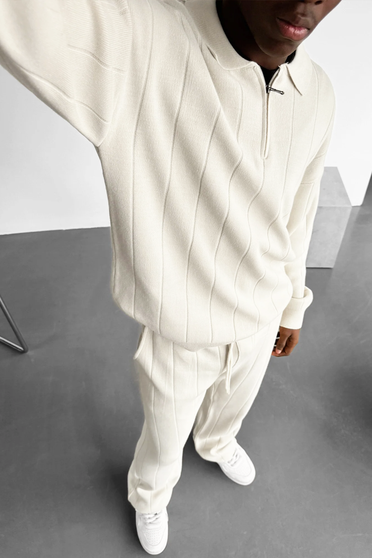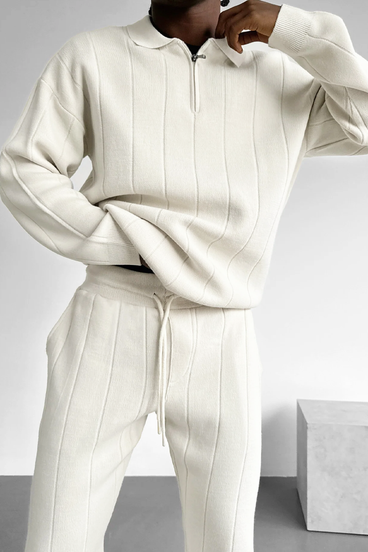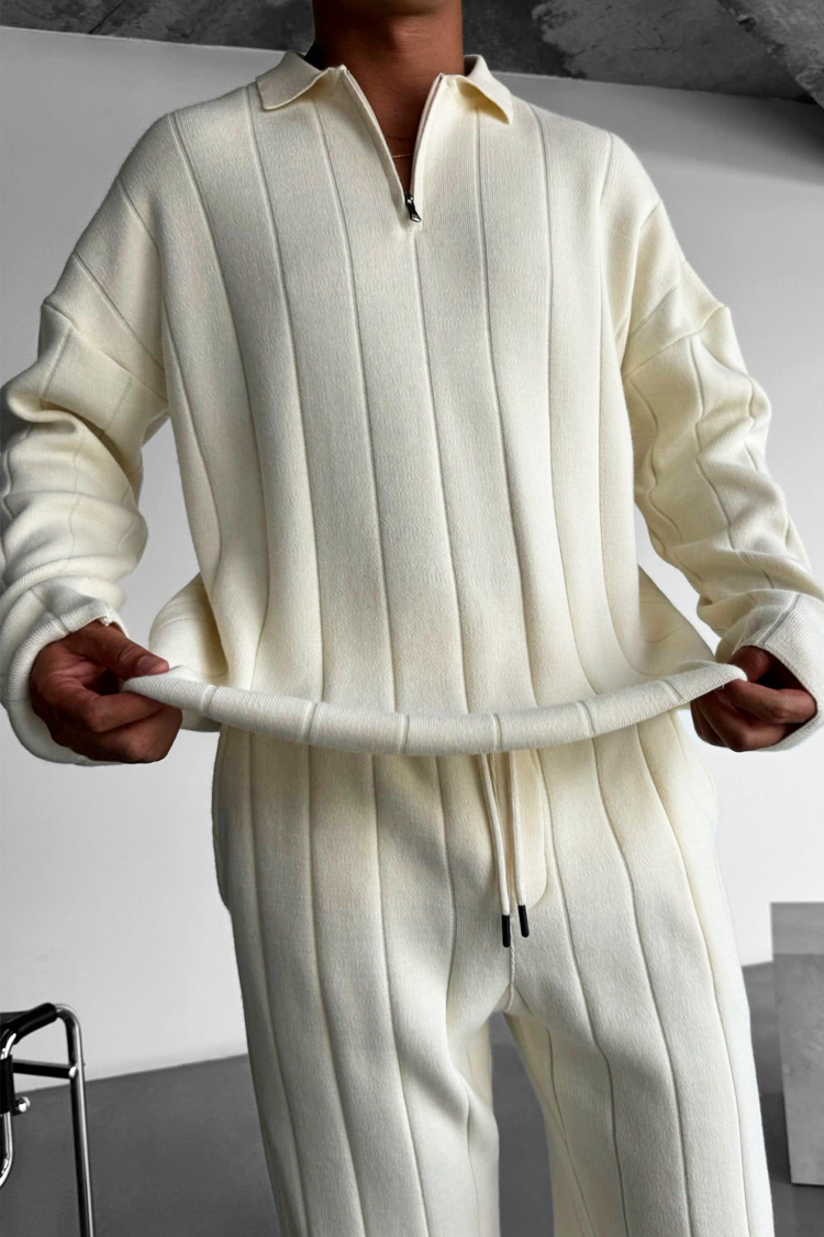 - Wygodny męski dwuczęściowy komplet składający się z bluzki z kołnierzykiem i spodni.