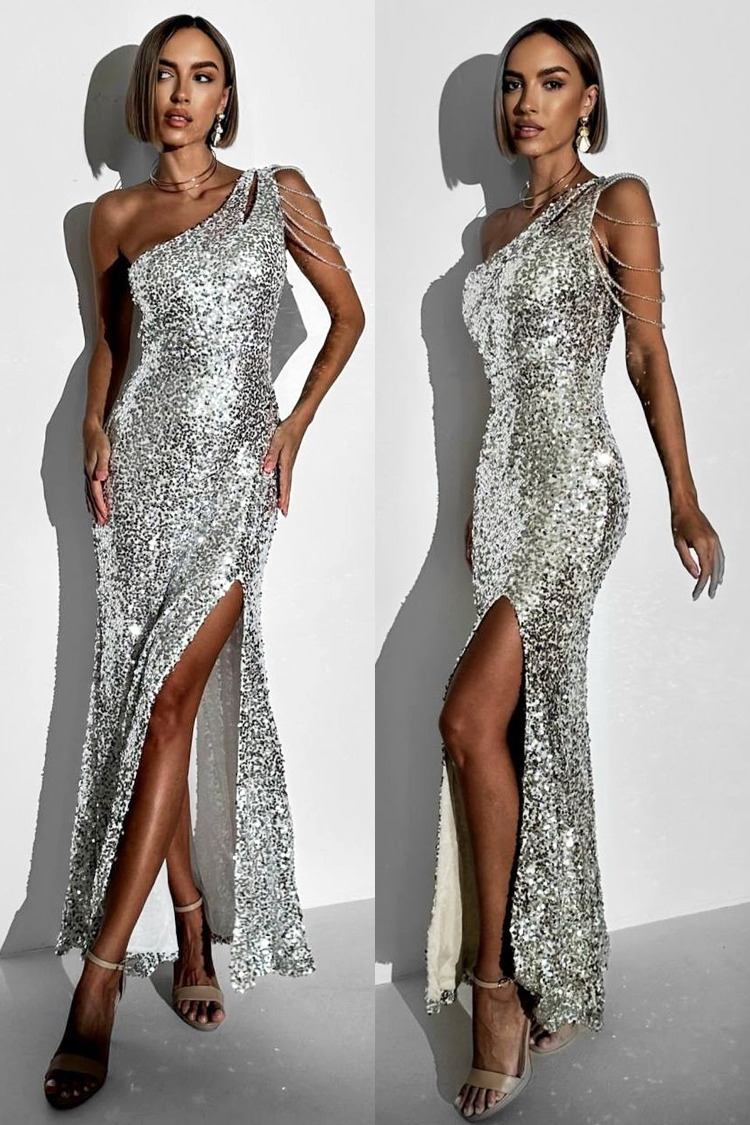 - Model ma asymetryczny dekolt, efektowny detal w postaci łańcuszków na jednym ramieniu i wysokie rozcięcie, elegancko podkreślające sylwetkę.