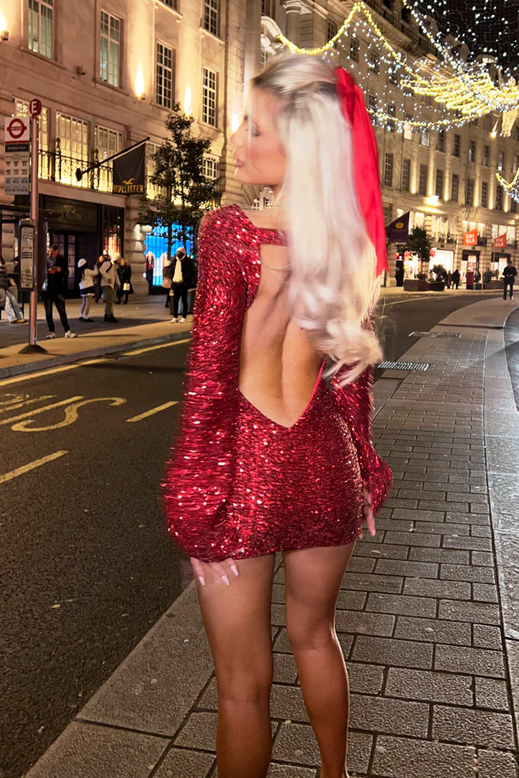 - Model ma dopasowany krój, błyszczące detale na całej długości, długie rękawy i odkryte plecy.