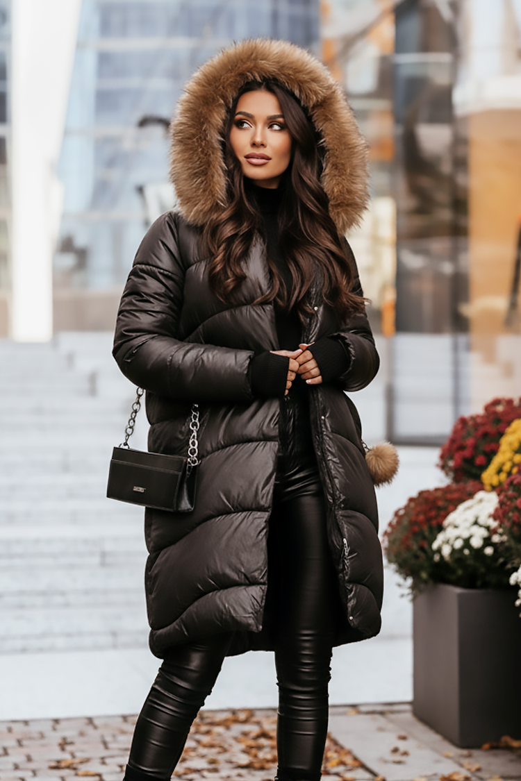 - Model posiada puchowy kaptur i praktyczne kieszenie, pikowany wzór oraz ozdobne wykończenie kieszeni.