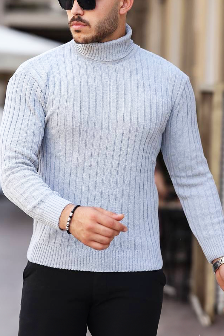 - Wygodny męski golf i pionowym prążkowanym wzorem w kolorze szarym, pasujący do różnych stylizacji.