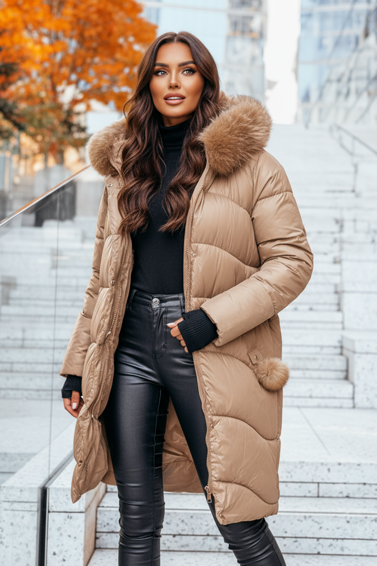 - Model posiada puchowy kaptur i praktyczne kieszenie, pikowany wzór oraz ozdobne wykończenie kieszeni.