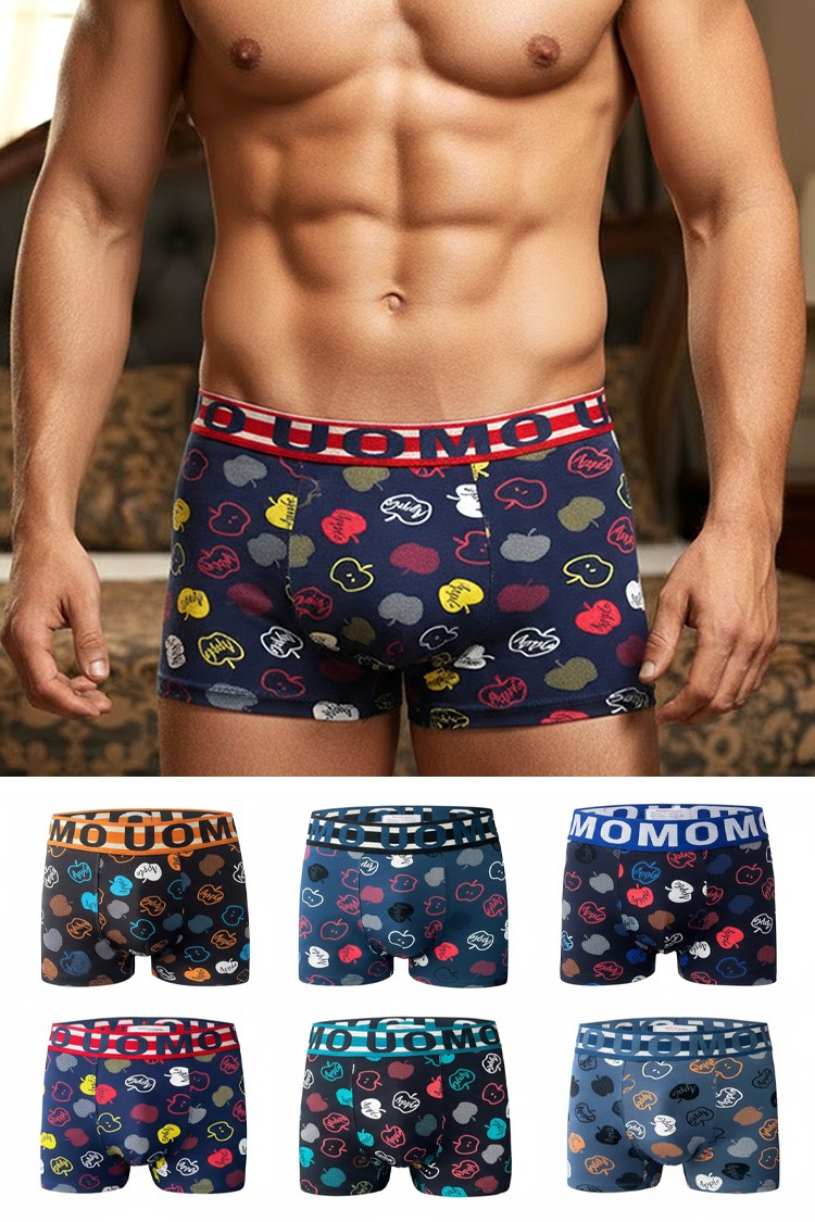 - Zestaw sześciu sztuk męskich bokserek z nadrukiem, wykonanych z bawełnianego, oddychającego materiału.