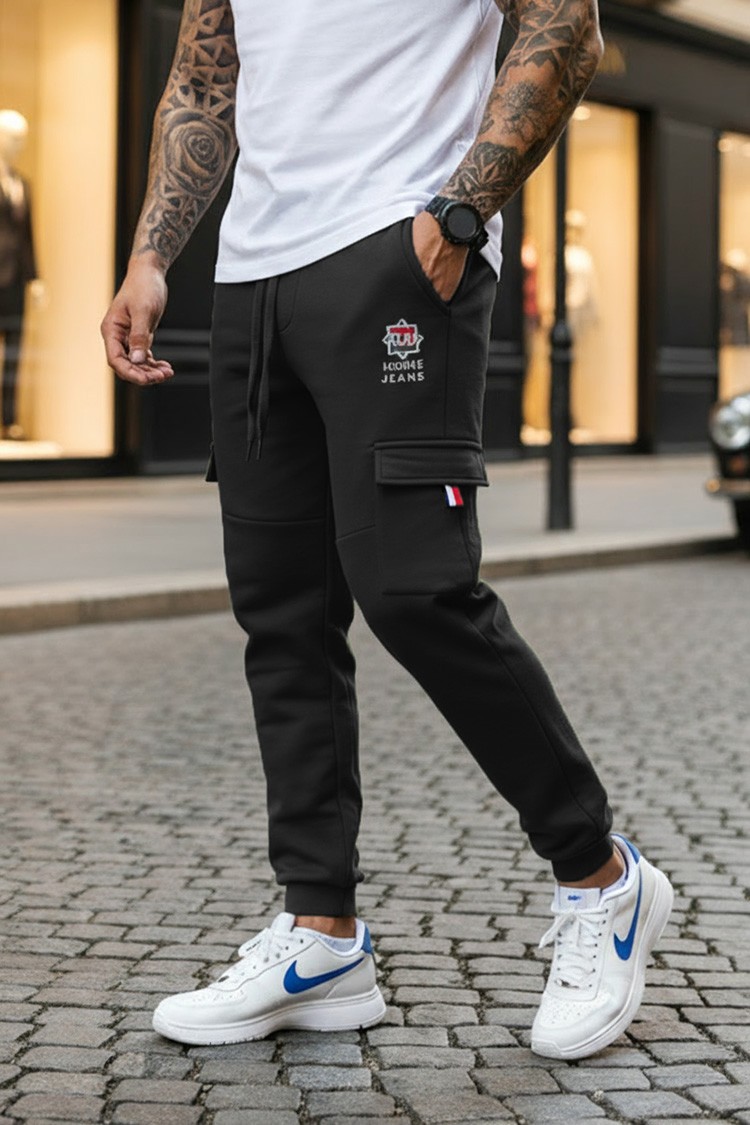 - Męskie spodnie w kolorze czarnym, odpowiednie na codzienne lub sportowe.