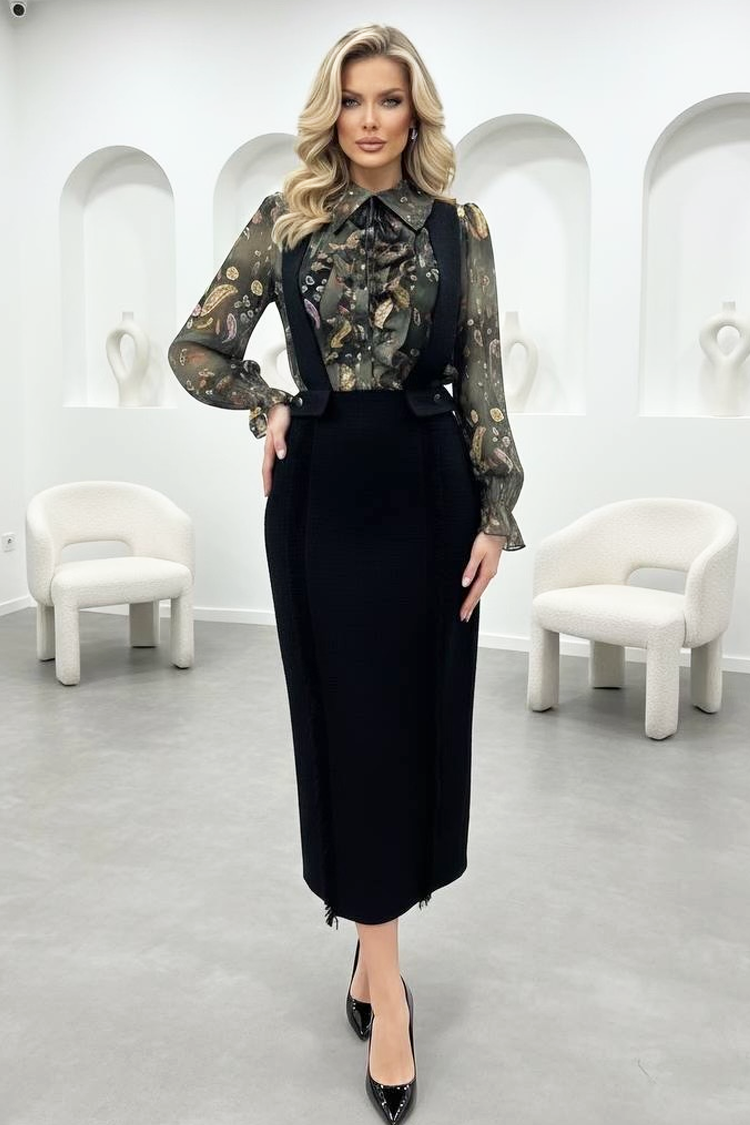 - Model ma dopasowany krój, stylowe paski do pończoch i efektowny szyfonowy top z długimi rękawami.