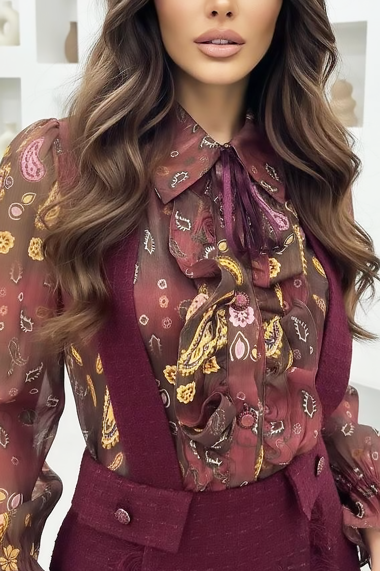 - Model ma dopasowany krój, stylowe paski do pończoch i efektowny szyfonowy top z długimi rękawami.