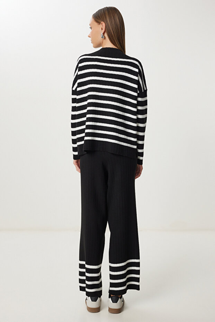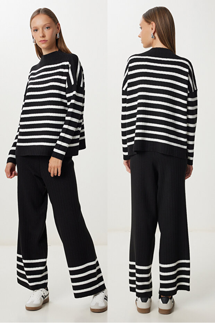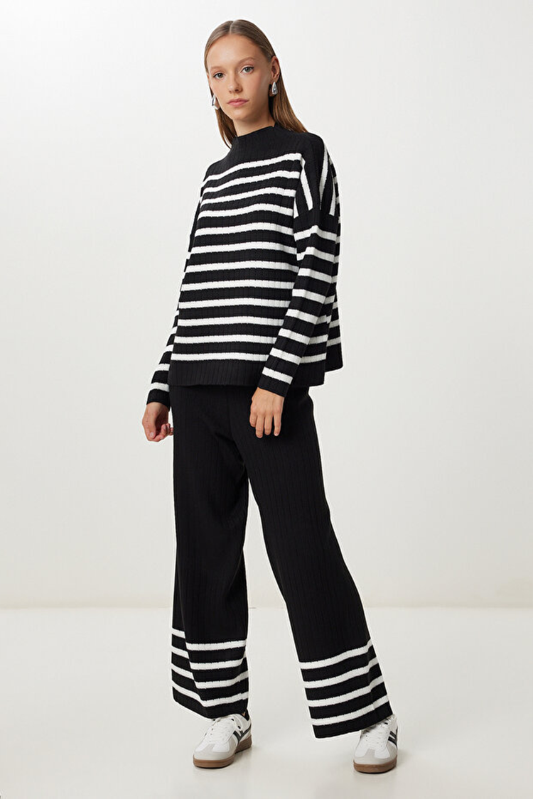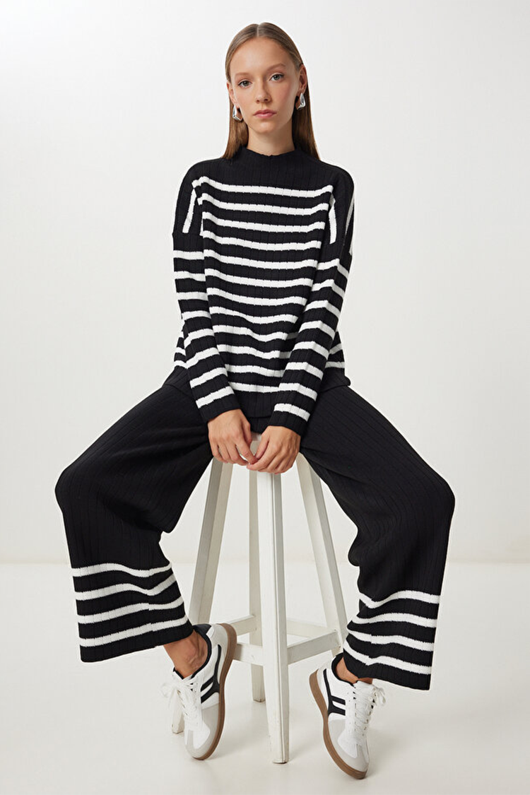 - Bluzka ma luźny krój, a spodnie mają wysoki stan i szerokie nogawki.