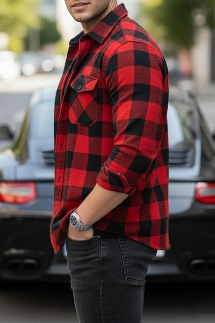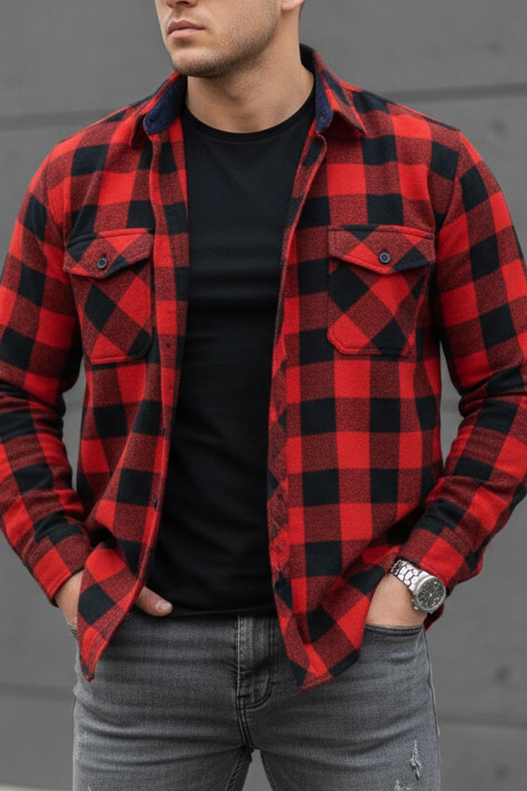 - Nowoczesna męska koszula w kratkę w kolorze czerwonym ze spiczastym kołnierzykiem i dużymi kieszeniami z patkami.