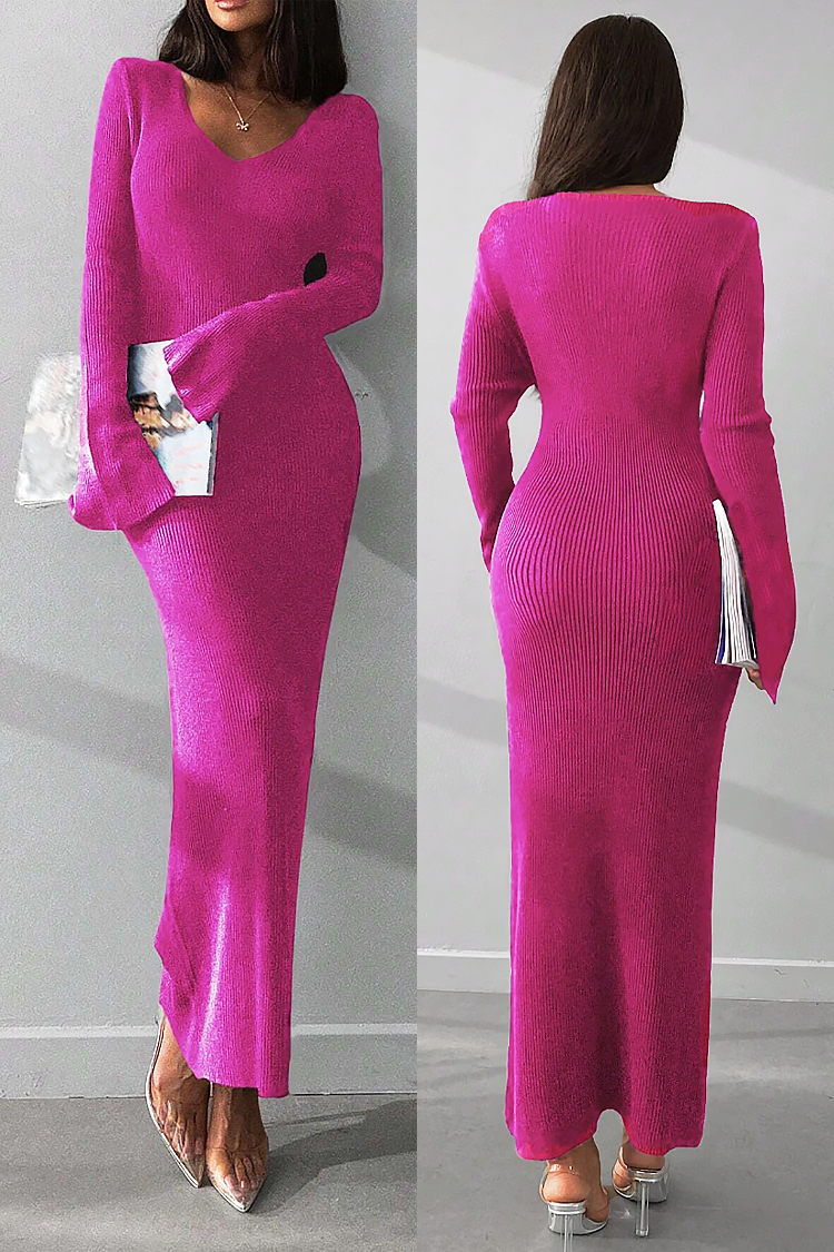 - Aby uzyskać stylowy wygląd, wybierz tę długą sukienkę w jednolitym kolorze.