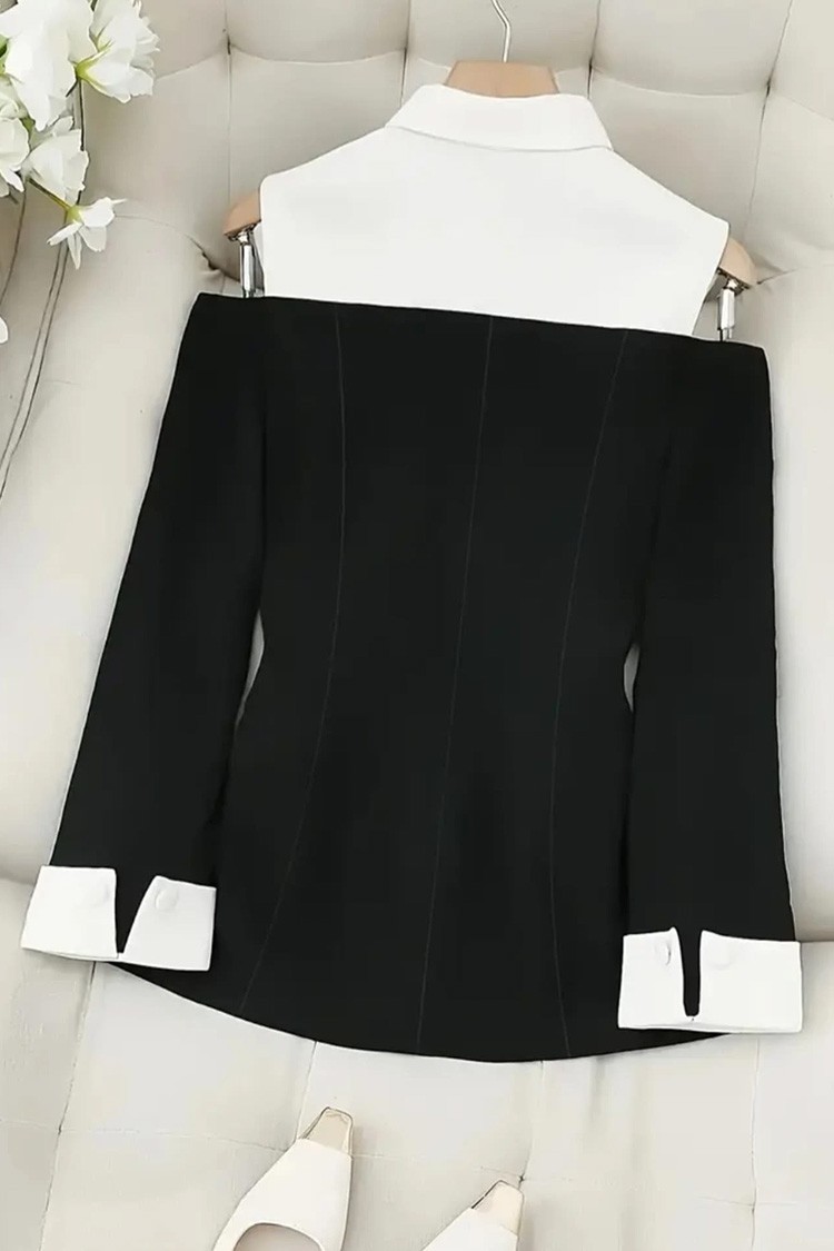 - Połącz styl z wygodą! Model ma elegancki, dopasowany krój, odkryte ramiona i efektowny efekt koszuli.