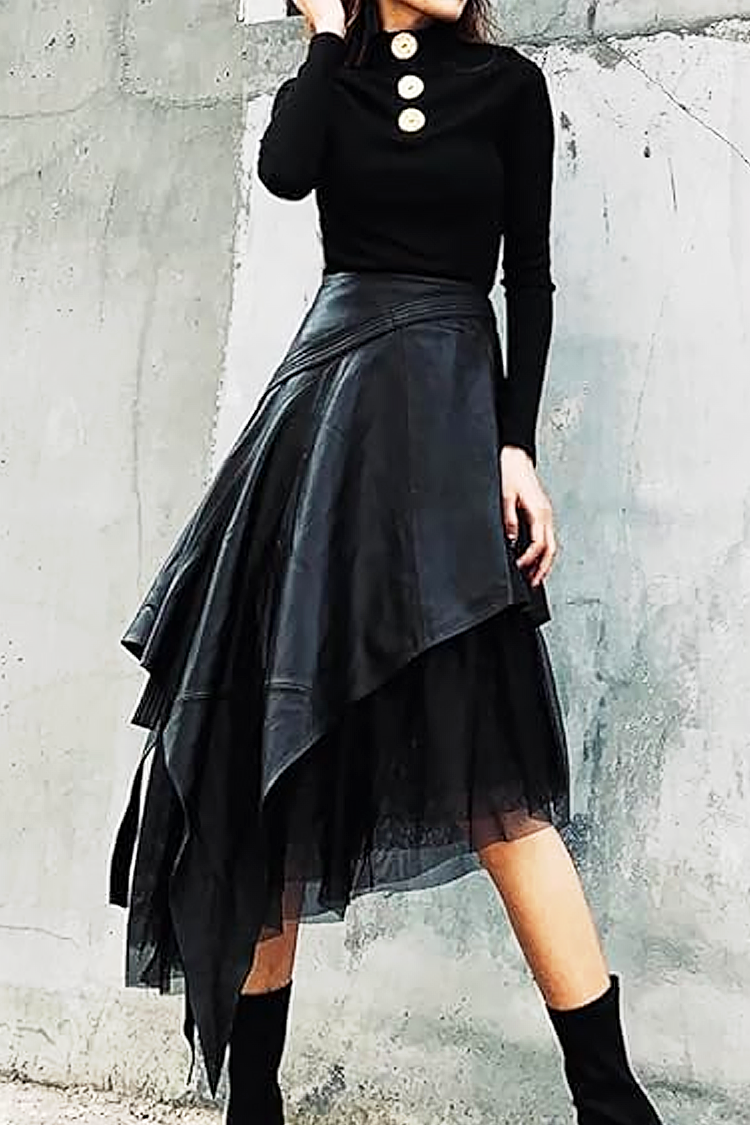 - Stylowa i delikatna spódnica midi z ekoskóry, idealna na różne okazje.