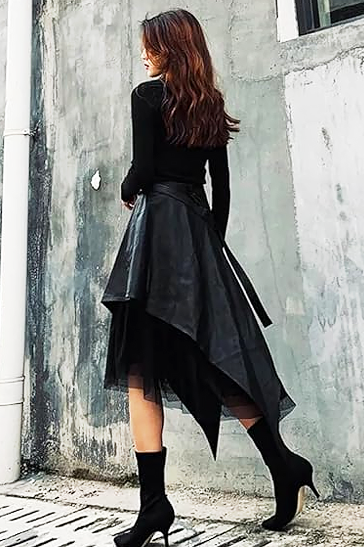- Asymetryczny krój, seksowny fason, tiulowa podszewka i efektowny pasek z ekoskóry wiązany z tyłu