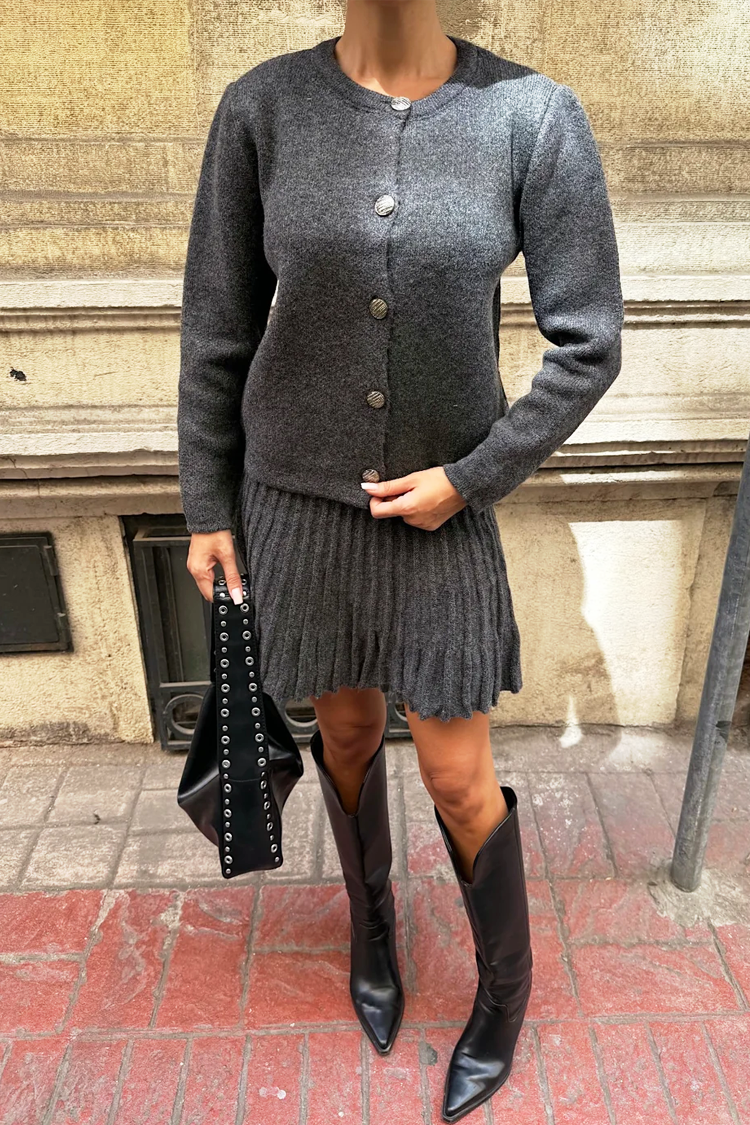 - Kardigan ma okrągły dekolt i efektowne guziki z przodu.