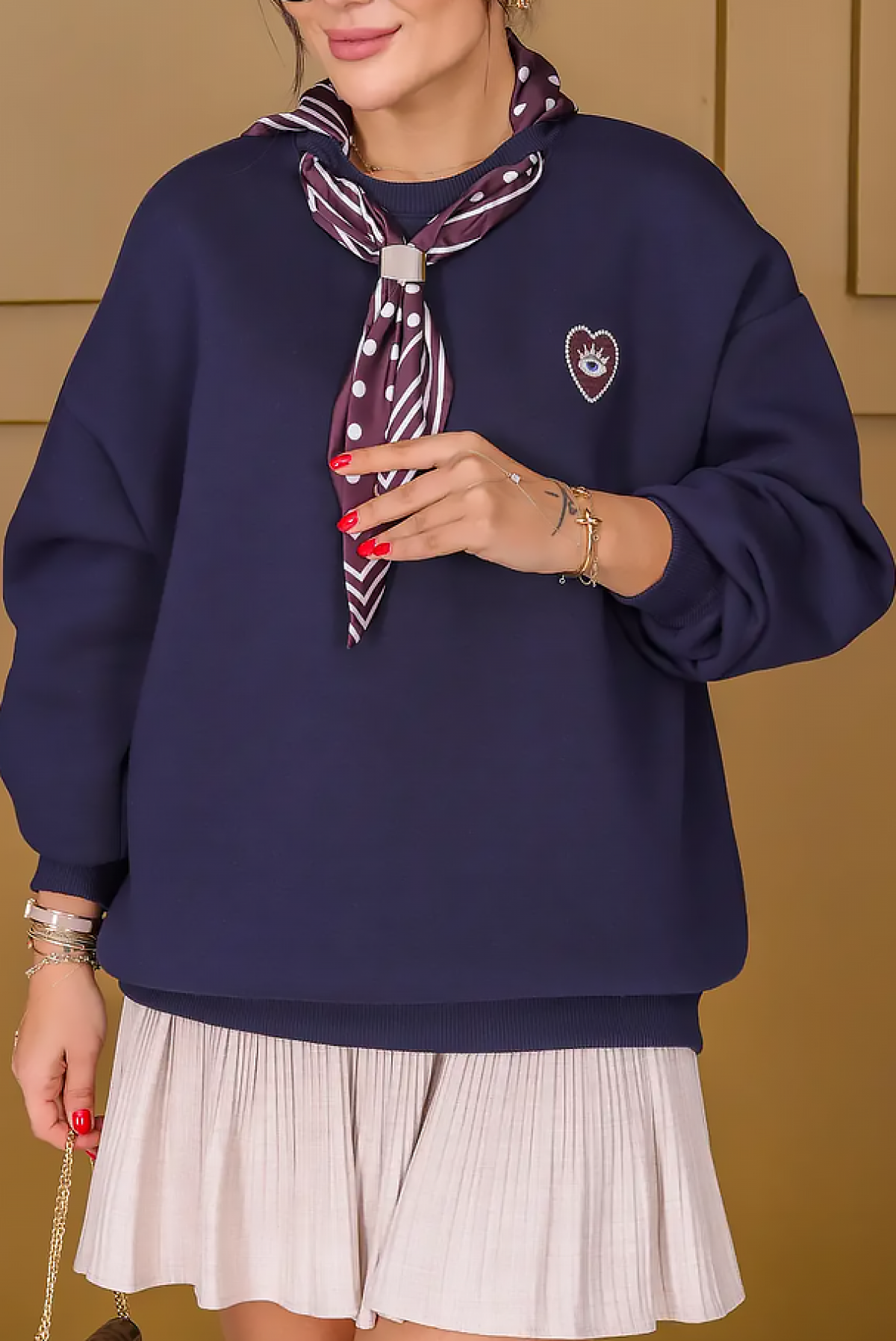 - Model ma okrągły dekolt, wygodny krój, atrakcyjny nadruk i efektowną apaszkę.