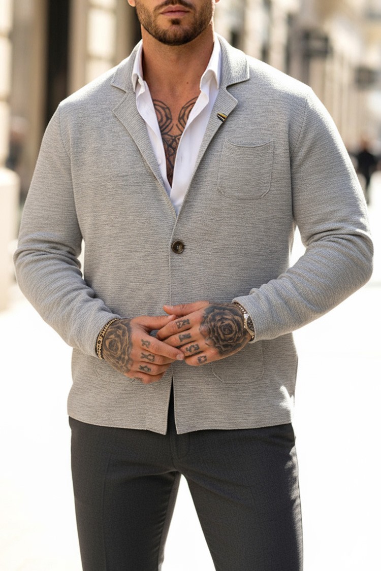 - Praktyczna męska kardigan w kolorze szarym, pasującym do różnych stylizacji.