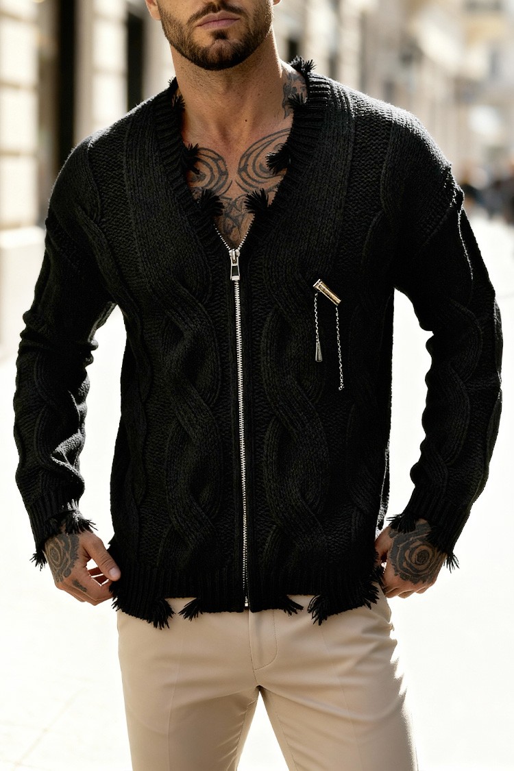 - Męski kardigan o efektownym wzorze w kolorze czarnym, pasująca do różnych, modnych stylizacji.