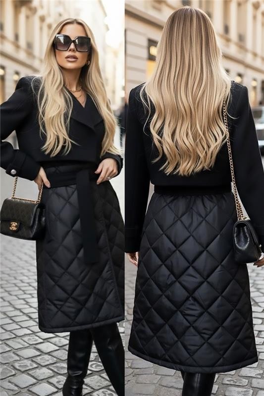- Model ma spektakularny krój, elegancki krój, kołnierz, mankiety i pikowany dół.
