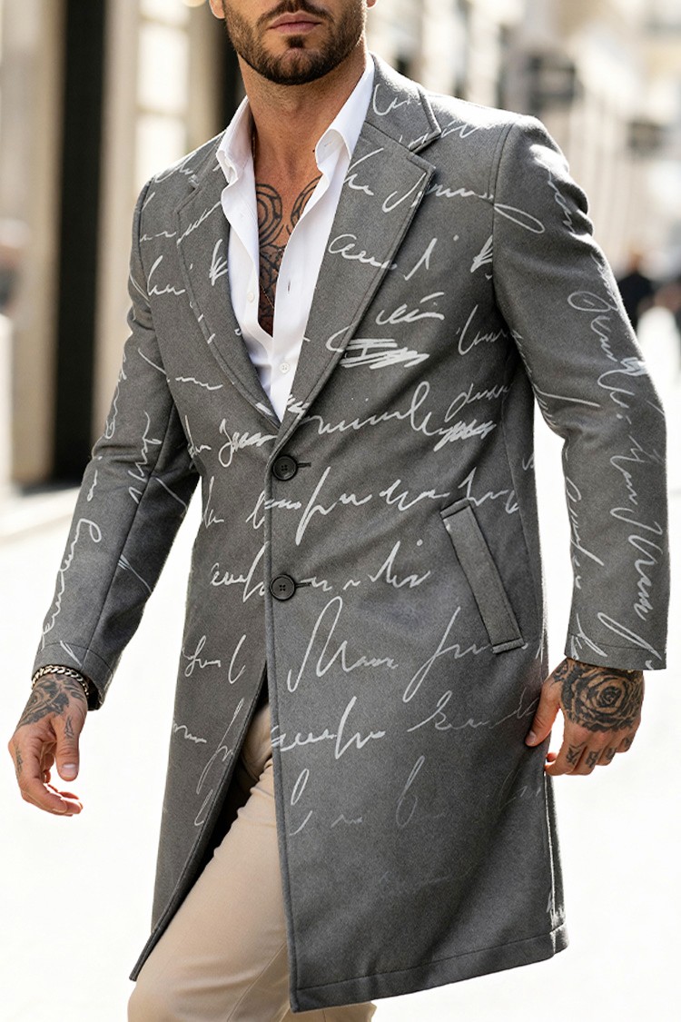 - Elegancki męski płaszcz o modelującej sylwetce z spektakularnym, odręcznym nadrukiem.