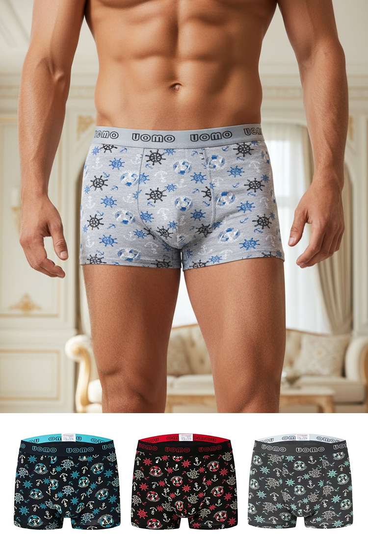 - Zestaw czterech męskich bokserek z marynarskim nadrukiem i gumką z napisem, wykonanych z bawełnianego, oddychającego materiału.