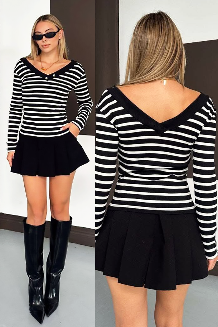 - Model ma wygodny i dopasowany krój, długie rękawy, dekolt i wzór w paski.
