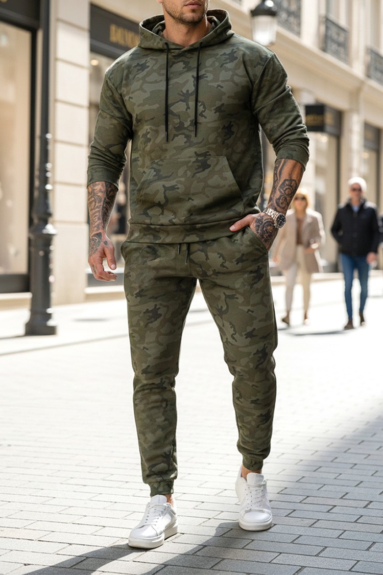 - Wygodny sportowy zestaw składający się z dwóch części w kamuflażu, składający się z bluzy i spodni.