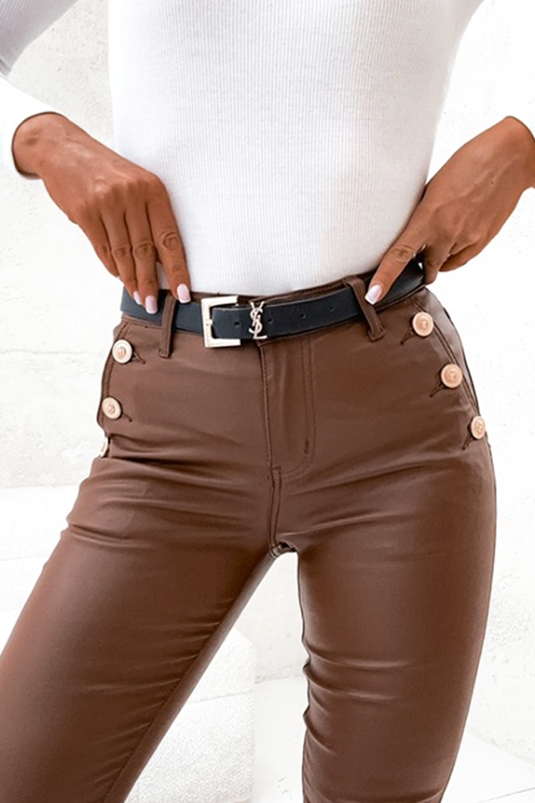 - Model ma wysoki stan i kieszeniami bocznymi zapinanymi na guziki.
