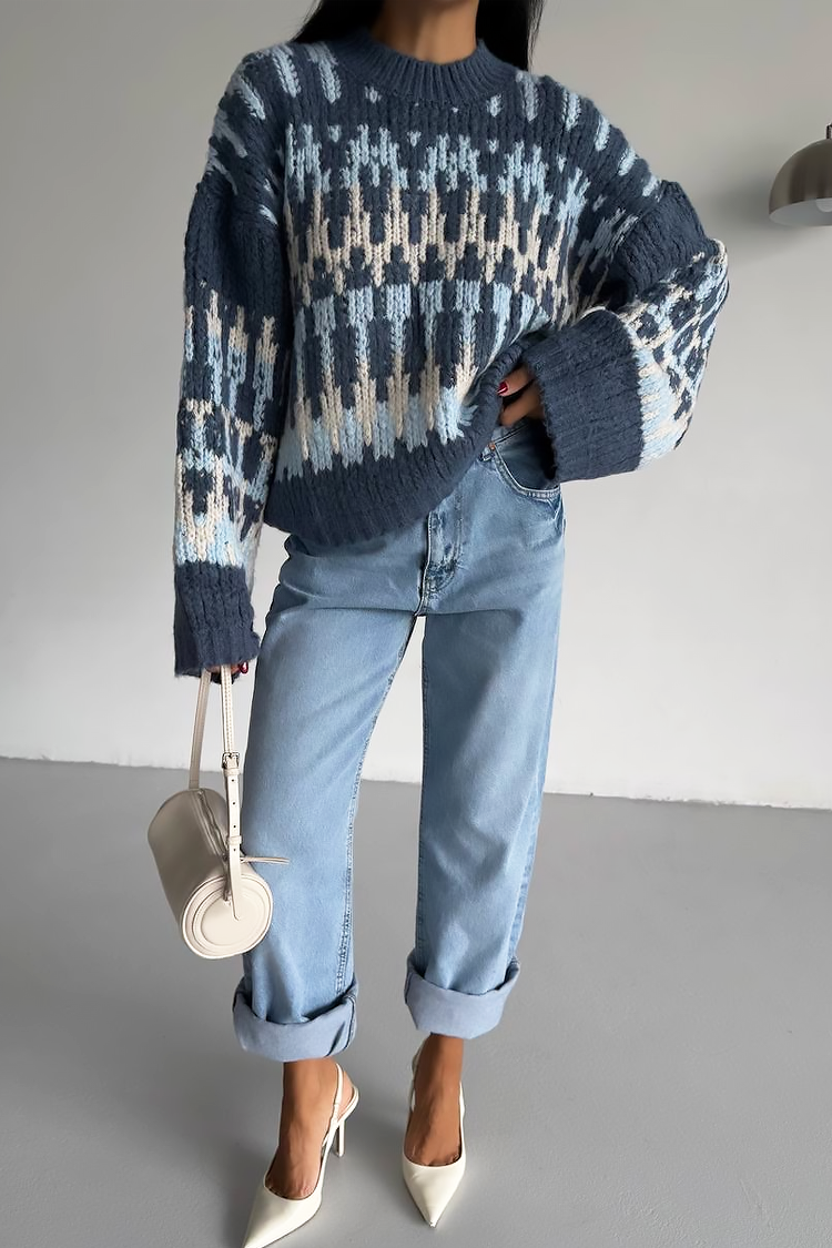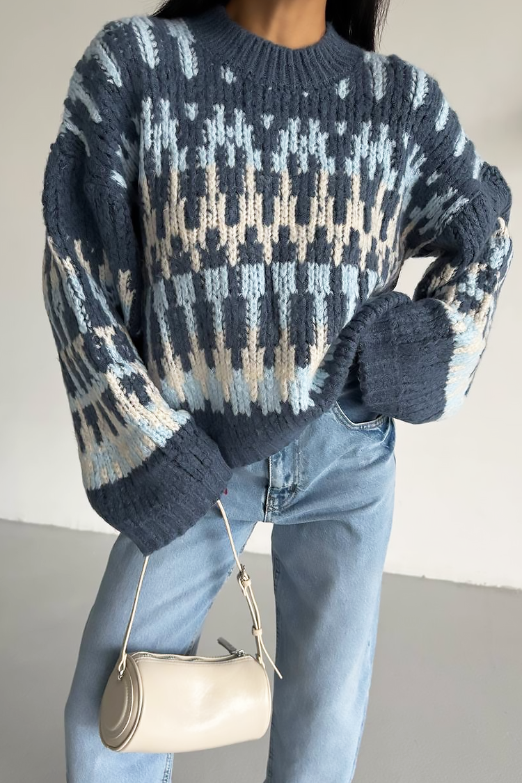 - Praktyczny sweter w wielokolorowy wzór, odpowiedni na co dzień.