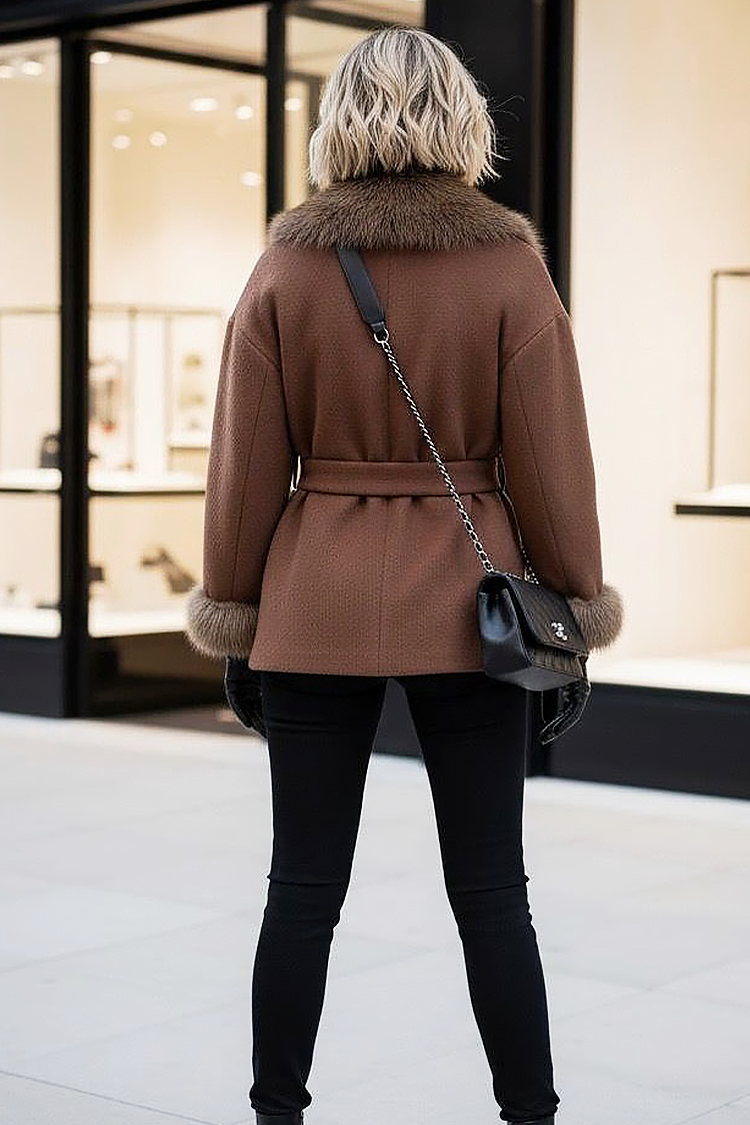 - Model ma klasyczny krój, pasek z tego samego materiału i obszerny puchowy kołnierz z mankietami.
