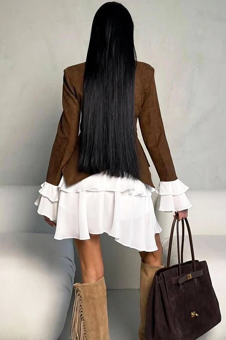- Żakiet ma okrągły dekolt i efektowne rękawy. Zapinany jest z przodu na guziki.