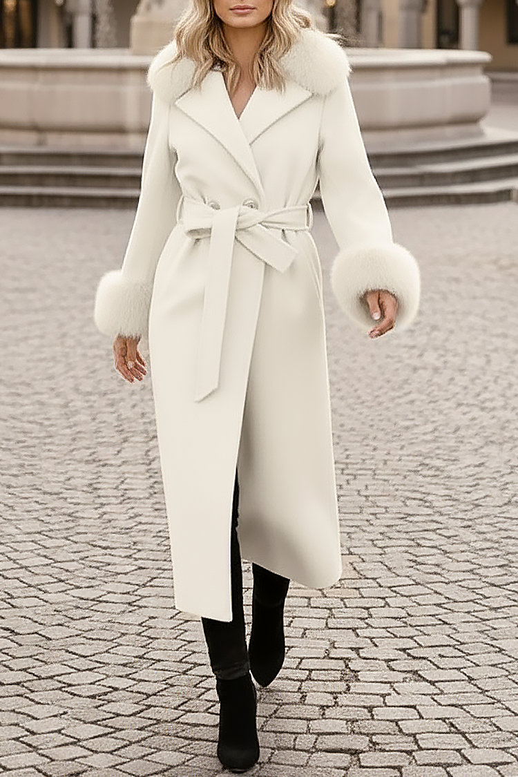 - Model ma klasyczny krój, pasek z tego samego materiału i obszerny puchowy kołnierz z mankietami.