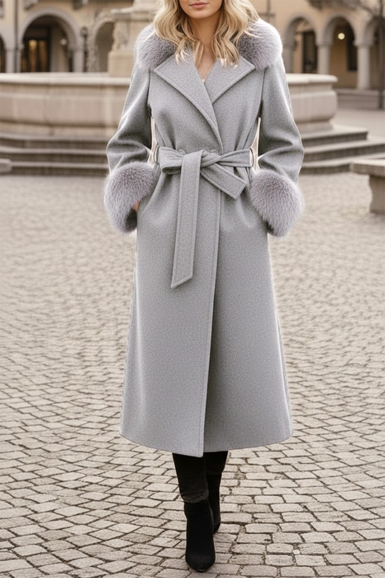 - Model ma klasyczny krój, pasek z tego samego materiału i obszerny puchowy kołnierz z mankietami.