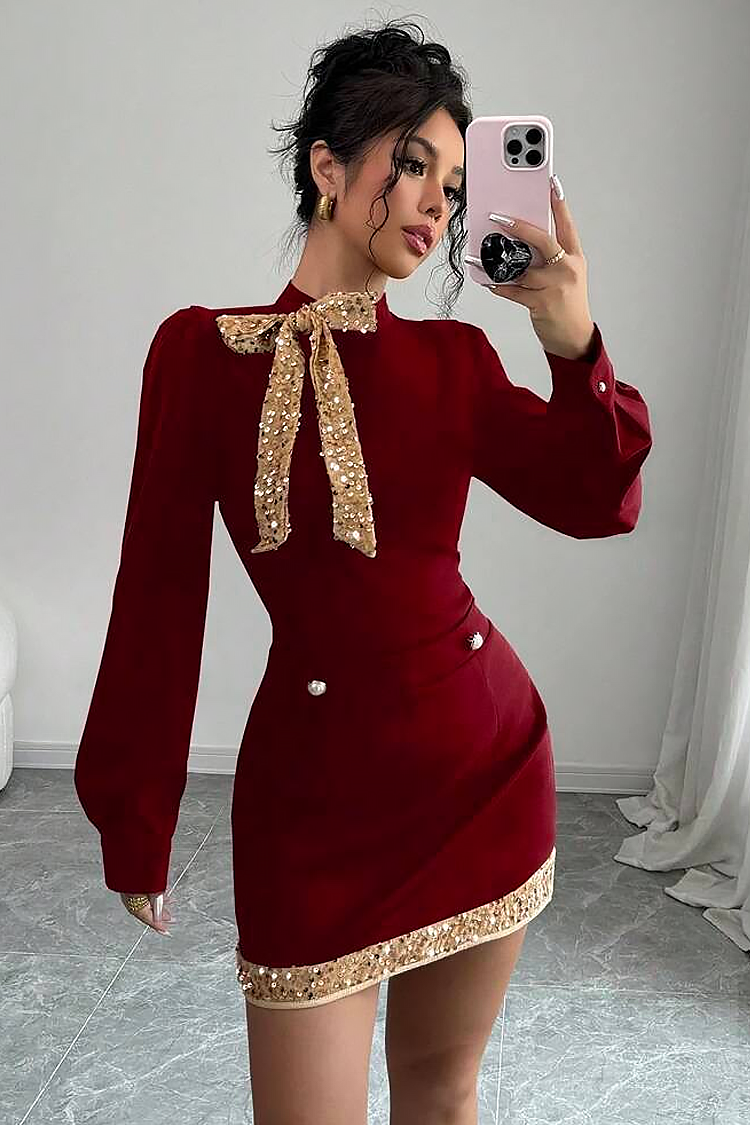 - Model ma ozdobną wstążkę z cekinami i bufiaste rękawy.