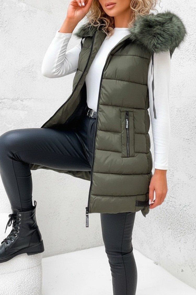 - Kamizelka ma klasyczny krój, wygodny kaptur z puchem i długą długość.