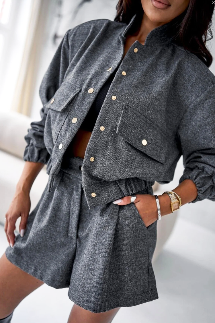 - Kurtka ma klasyczny krój i guziki, a szorty mają elegancki krój i kieszenie.