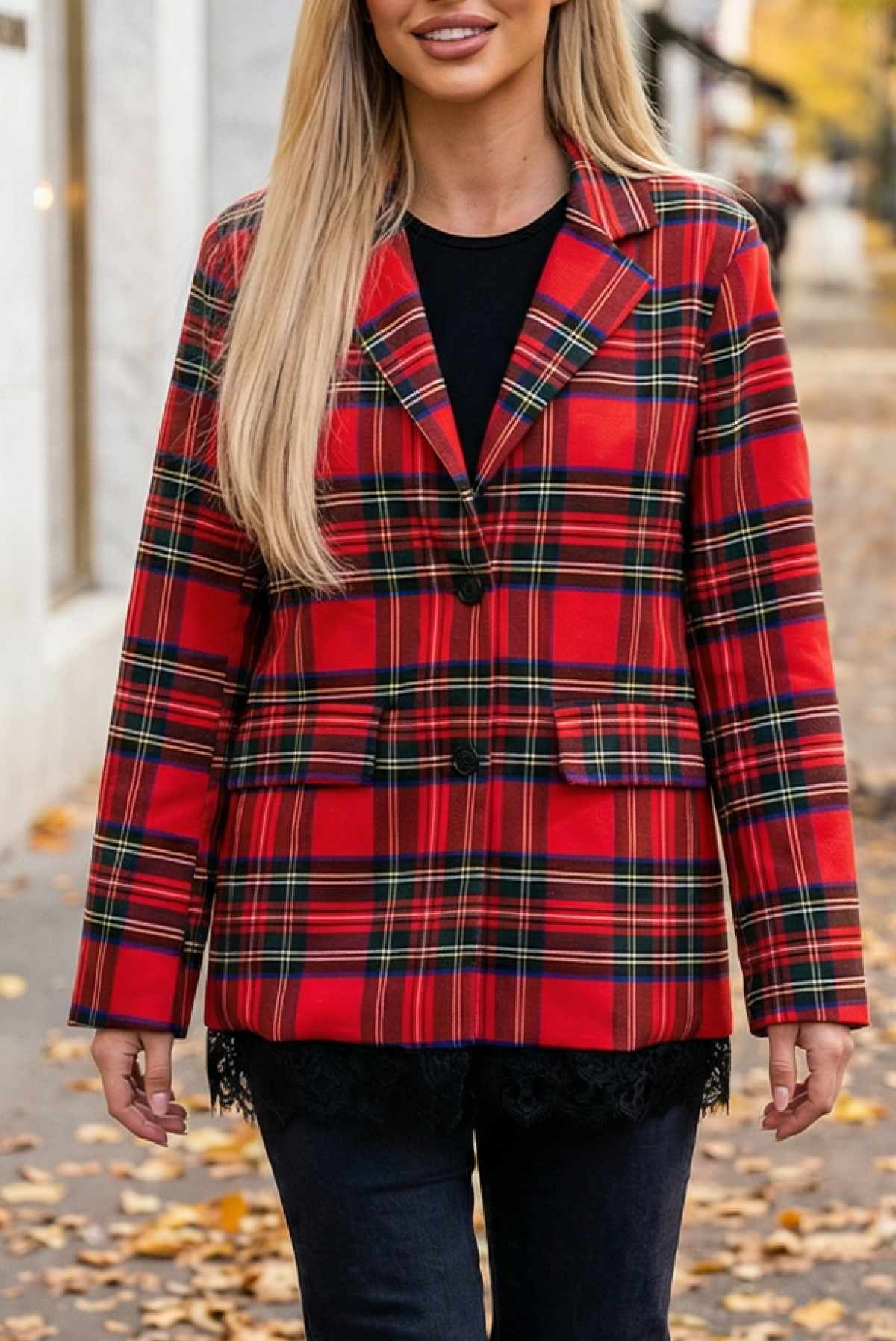 - Akcentem modelu są delikatne koronkowe detale u dołu marynarki oraz krata.