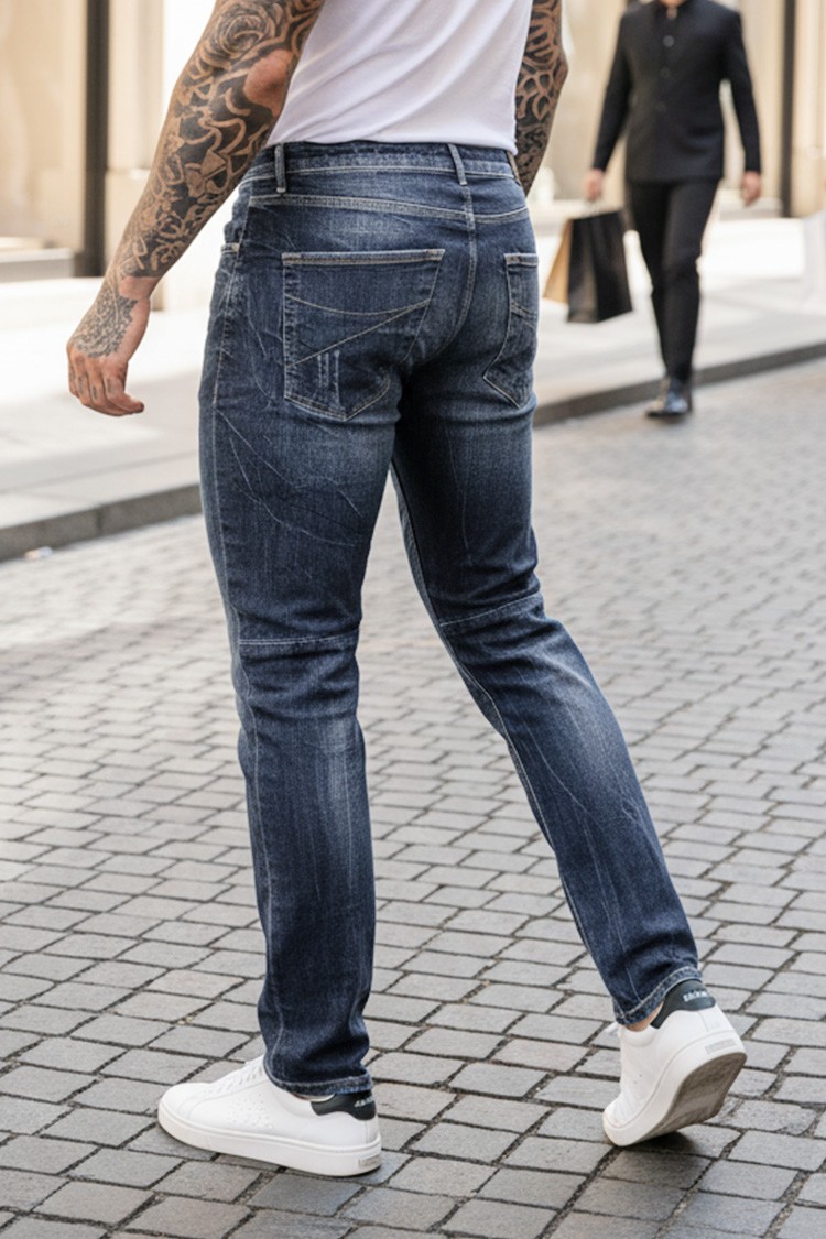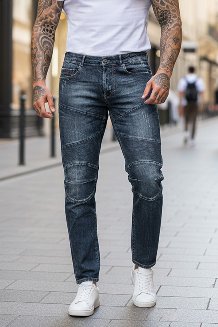 - Praktyczny model jeansów z ozdobnymi szwami i panelami na nogawkach, idealny na co dzień.