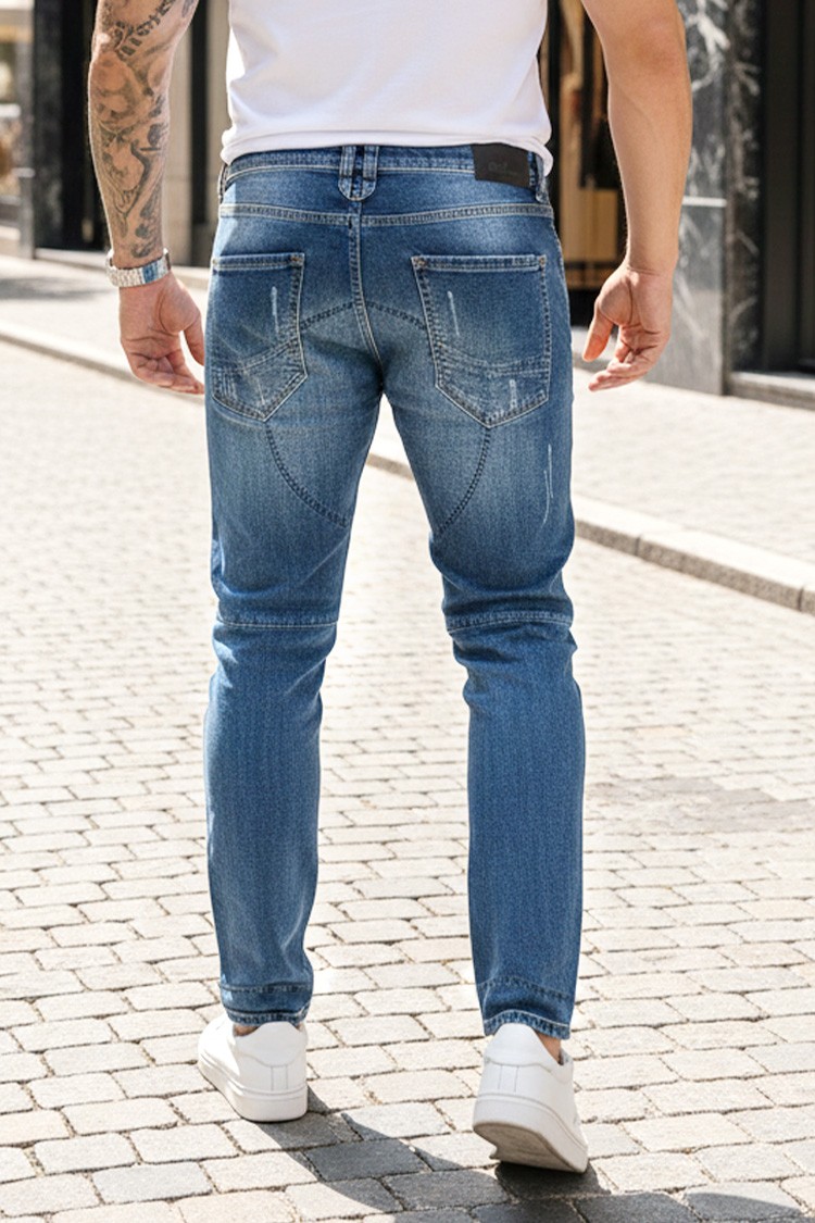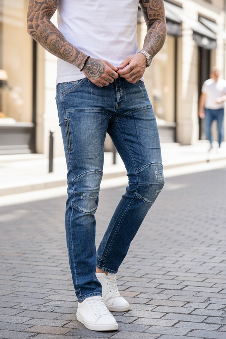 - Praktyczny model jeansów z ozdobnymi przetarciami i przeszyciami na nogawkach, idealny na co dzień.