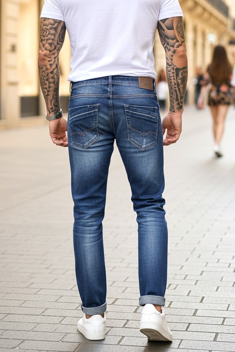 - Wykonane z bawełnianego denimu dla większego komfortu. Model zapinany jest na zamek i guzik, a podwinięte nogawki nadają mu bardziej swobodny wygląd.