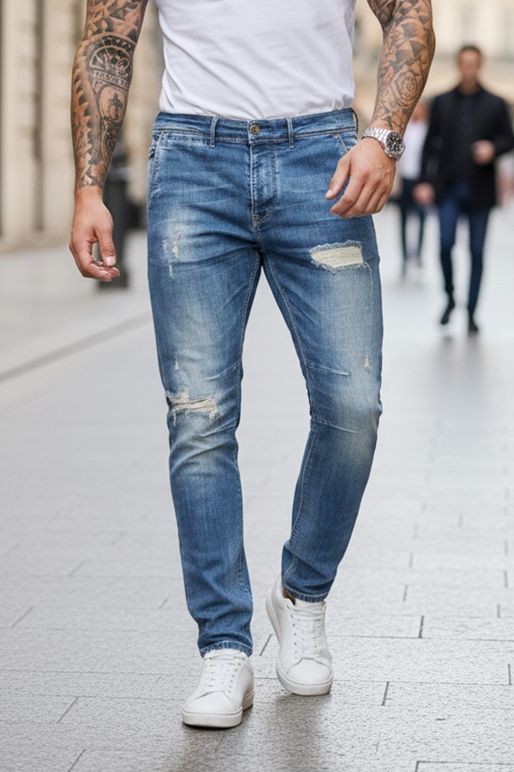 - Praktyczny model jeansów z dekoracyjnymi przetarciami i rozdarciami na nogawkach, odpowiedni do codziennego noszenia.