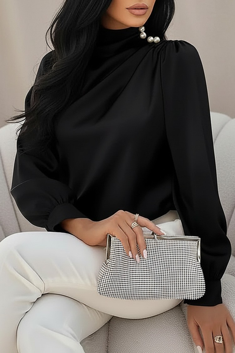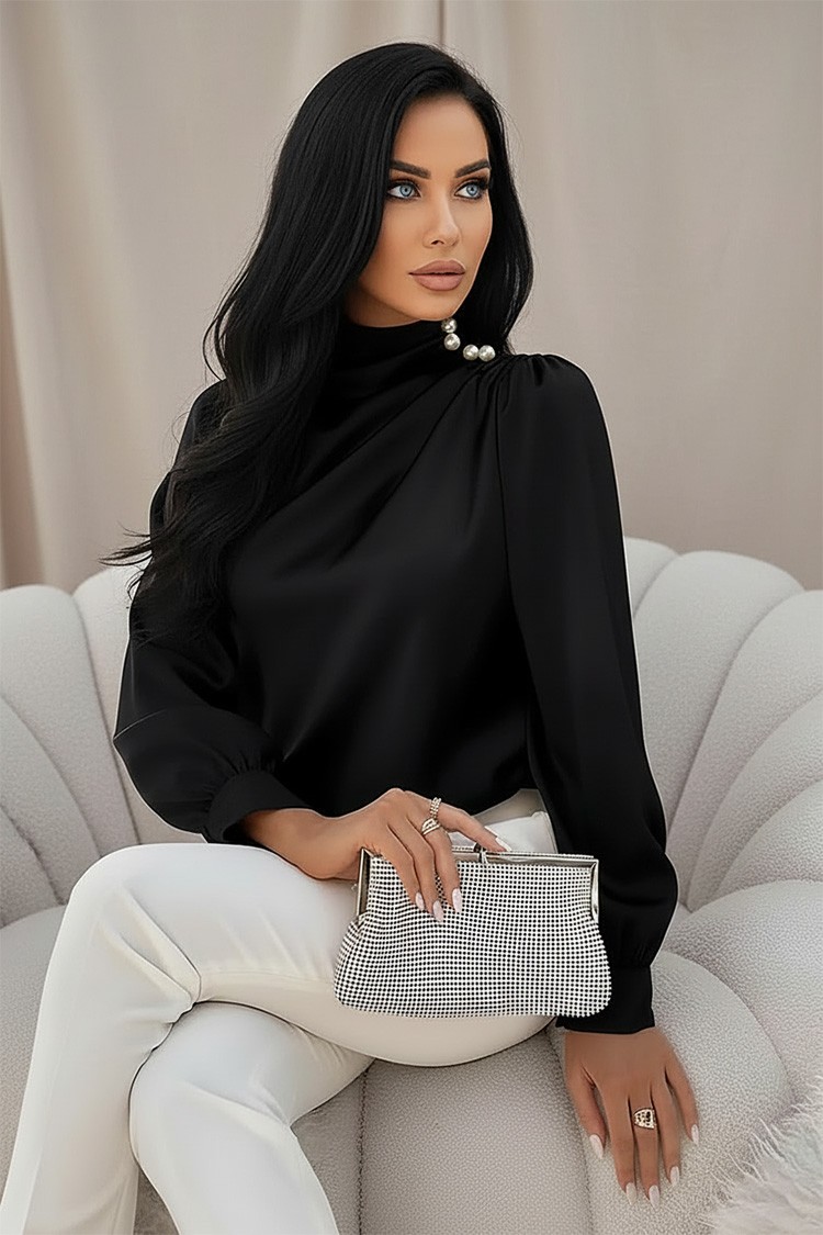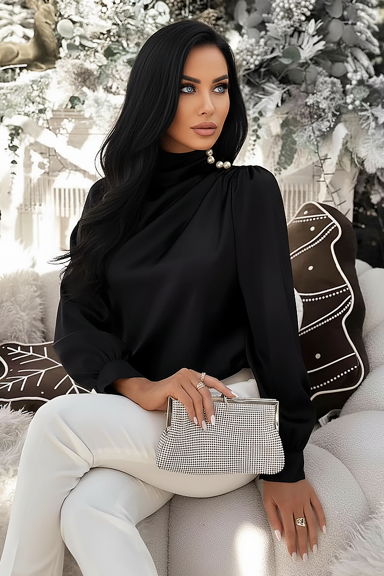 - Bluzka ma długie rękawy, elegancki krój i ozdobne perełki na ramieniu.