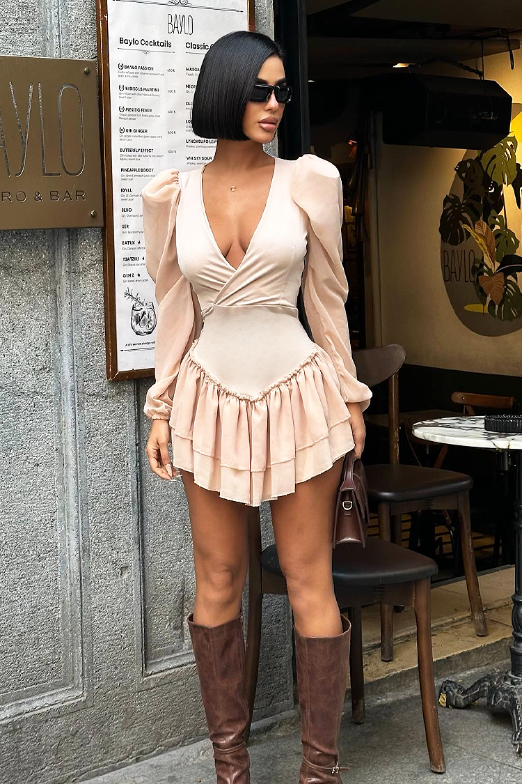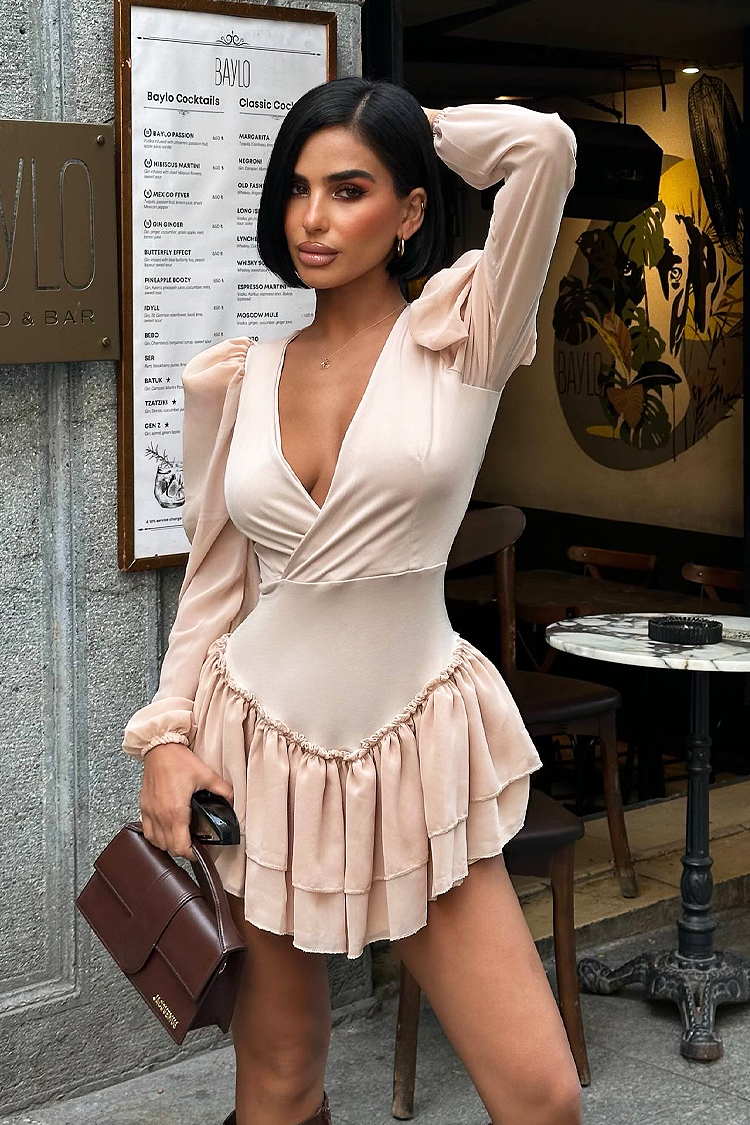 - Aby uzyskać idealny look, wybierz tę krótką sukienkę o atrakcyjnym wzorze w kolorze beżowym.